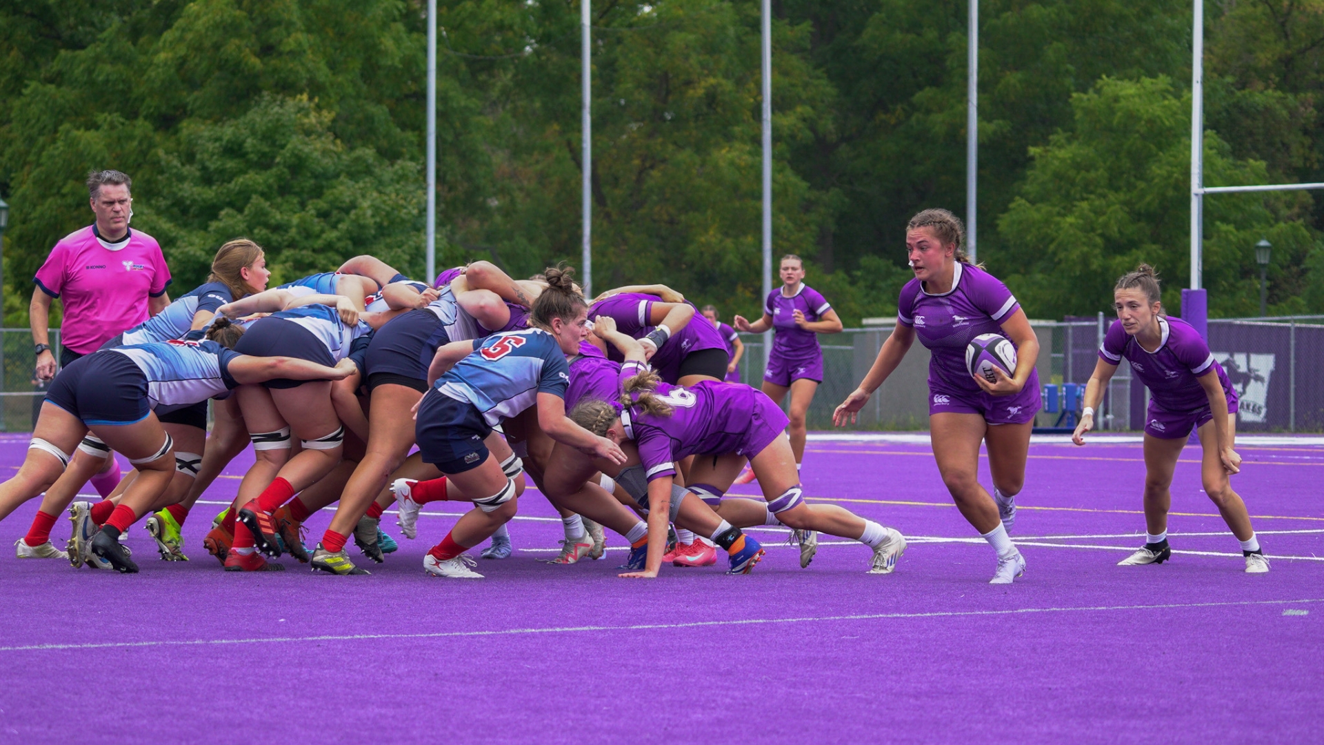 Several minutes after scoring their first points of the game, Guelph scored another try and successful conversion, bringing the score up to 0-12 ten minutes into the first half. Not long after this, Mustang Jenna Lawrence brought the team their first and only points for the match with a penalty goal, upping the score to 03-12.
